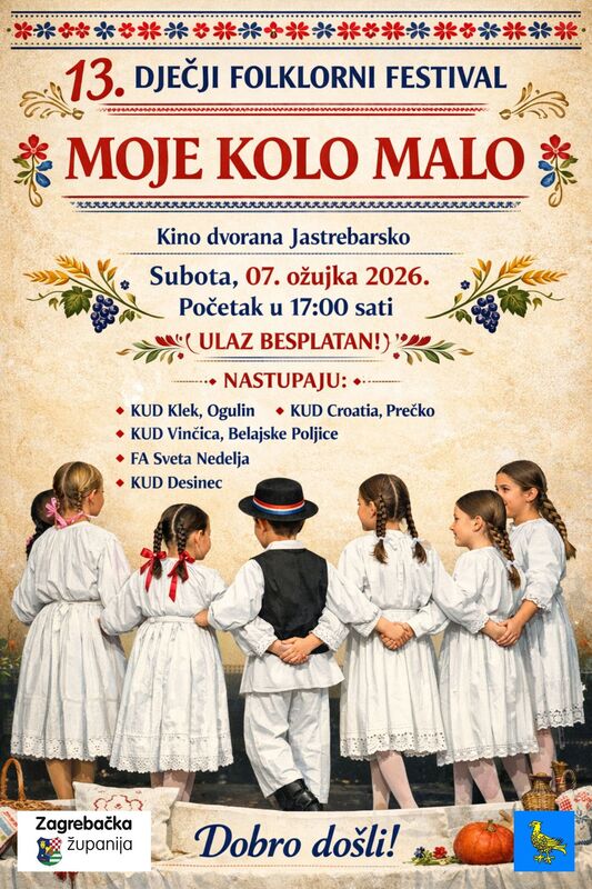 U subotu 07.ožujka održat će se tradicionalni dječji folklorni festival u organizaciji KUDa Desinec „Moje kolo malo“ . Festival počinje u 17.00h u Kino dvorani u Jastrebarskom, a ulaz je besplatan.
